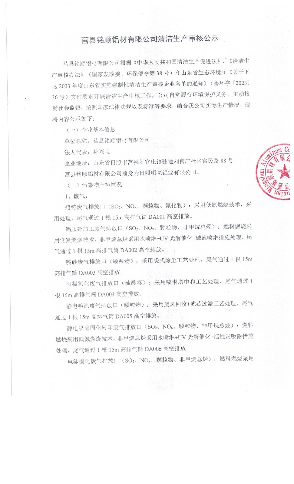 莒县铭顺铝材有限公司清洁生产审核验收公示
