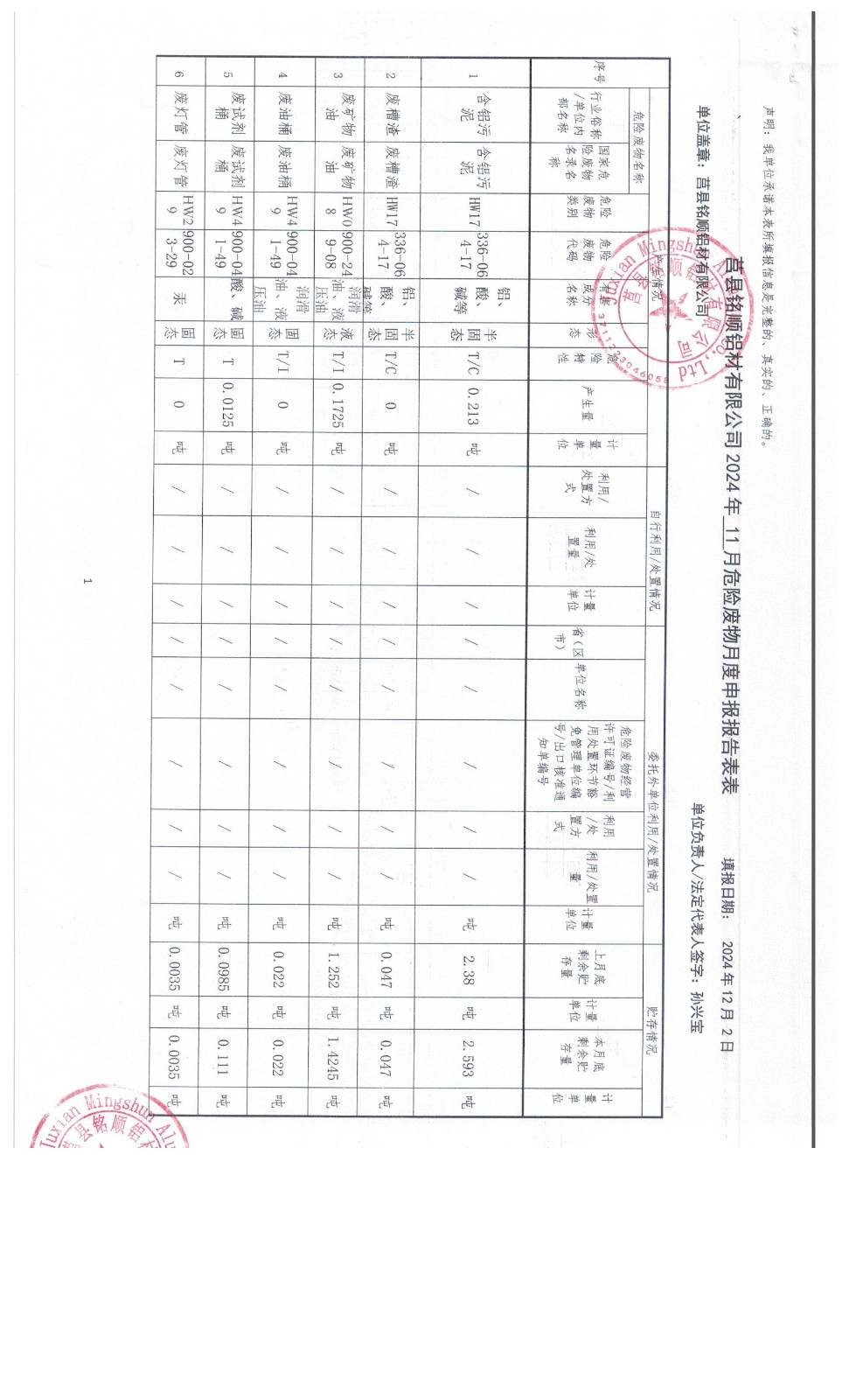 2024年12月危险废物报表