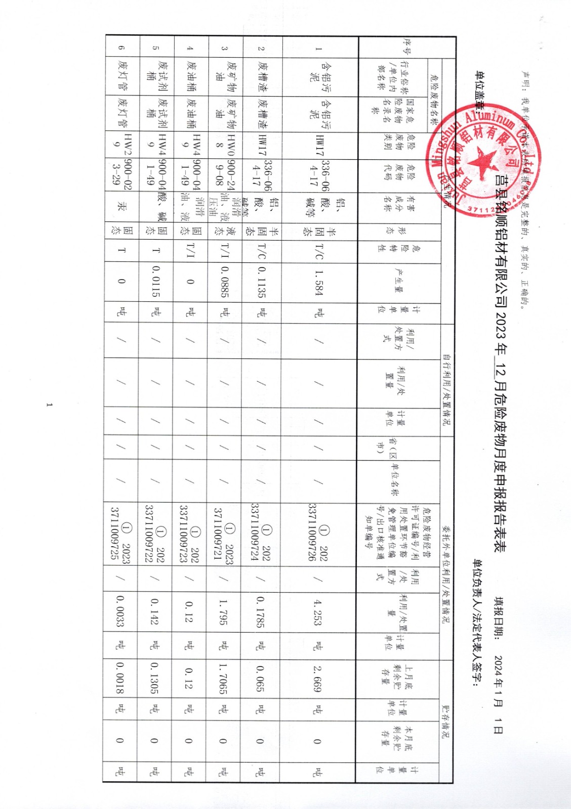 2023年12月危险废物报表新表