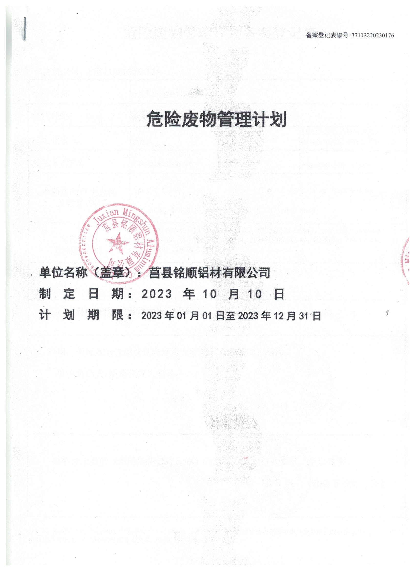 2023年管理计划10.25变更危废处置单位及量