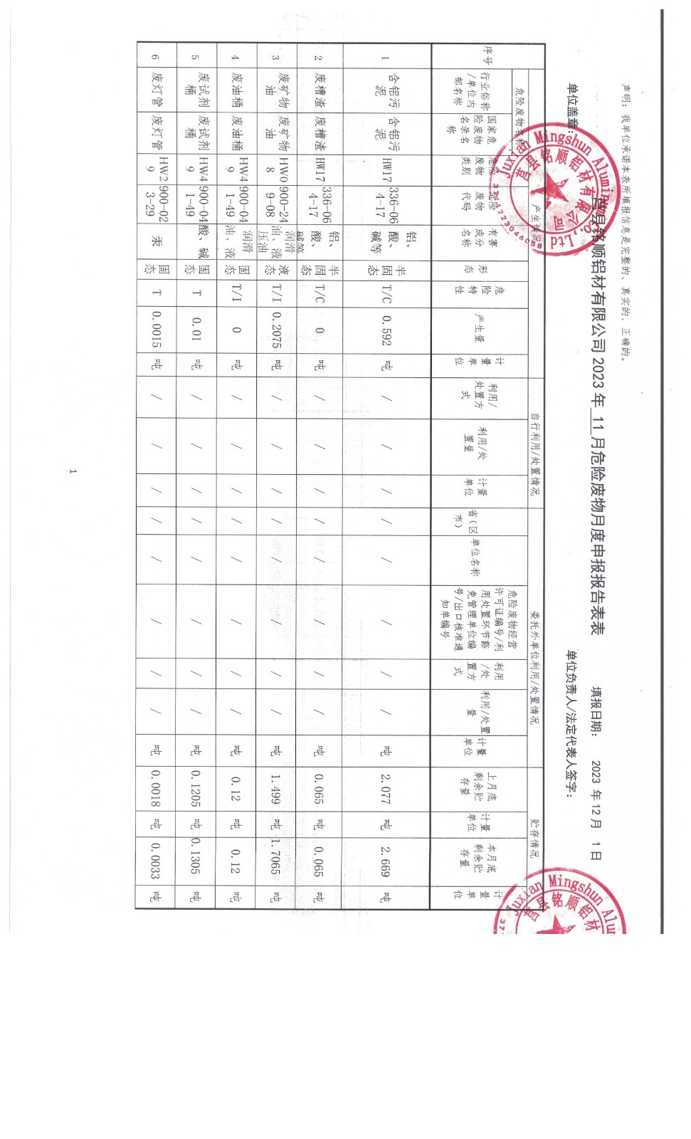 2023年12月危险废物报表新表